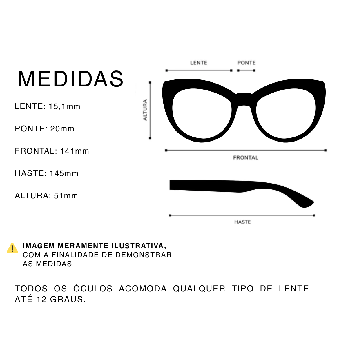 Na última foto de cada óculos, você encontra todas as medidas da armação, com uma imagem ilustrativa para facilitar a comparação com o seu modelo atual.