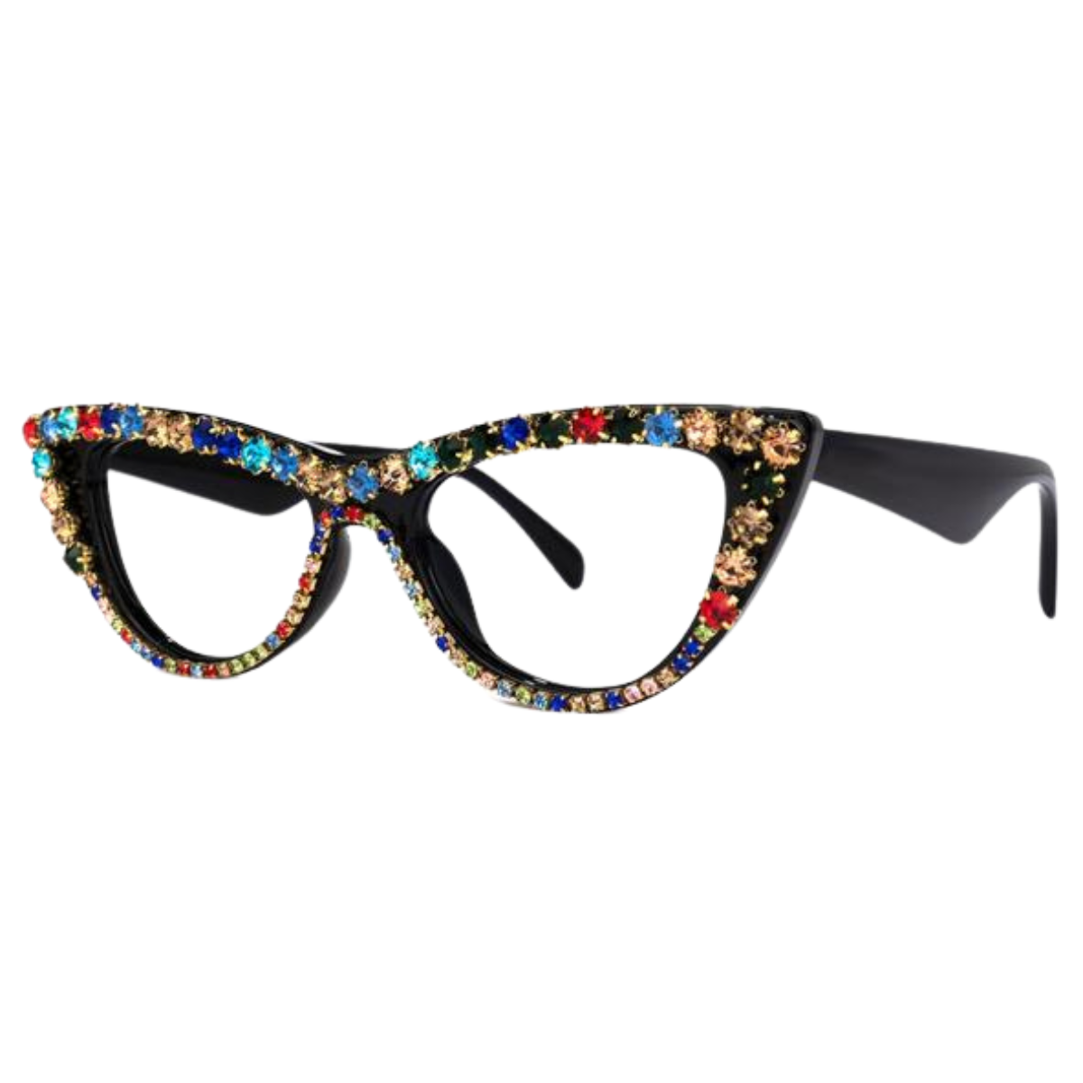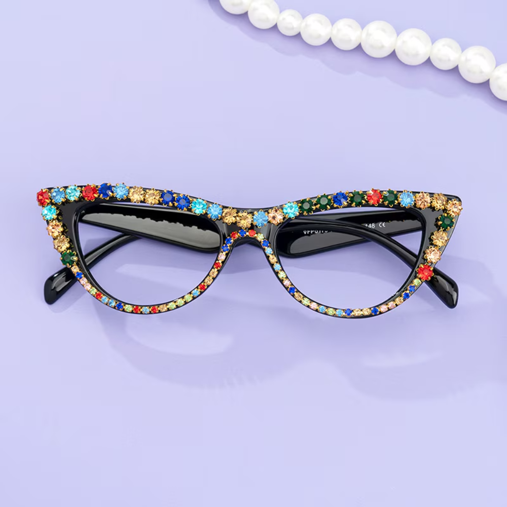 O Óculos Cath apresentam detalhes de strass e são feitos de plástico de alta qualidade. Com um formato distinto de olho de gato, se destaca. Além da cor multicolorida, oferecem uma variedade de estilos de combinação de cores. As lentes disponíveis incluem opções como luz anti-azul, para atender diversas necessidades visuais e ocasiões de uso.
