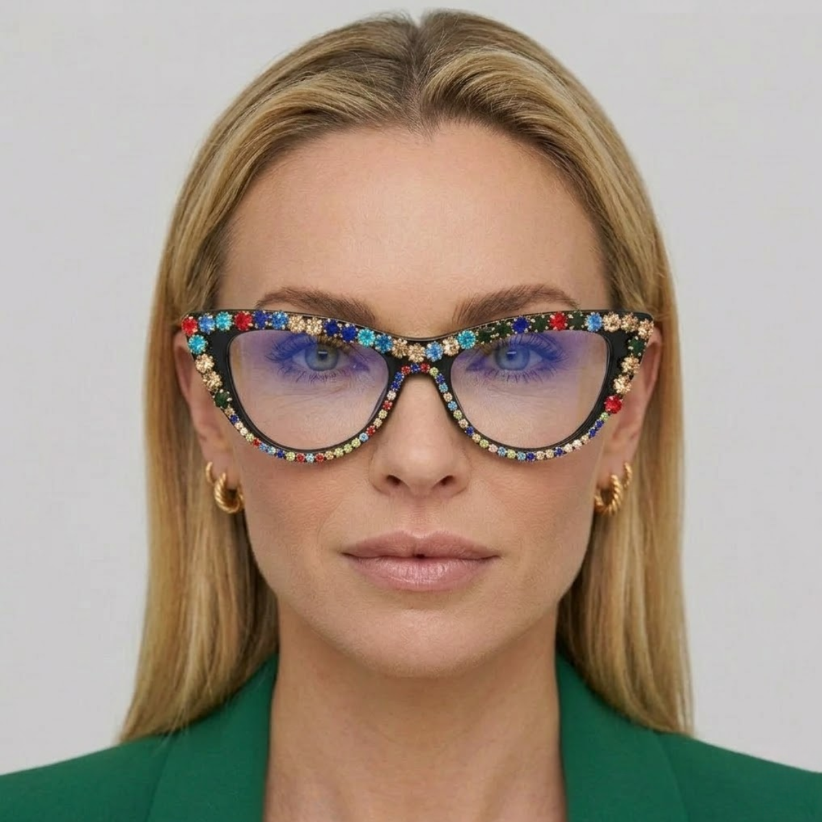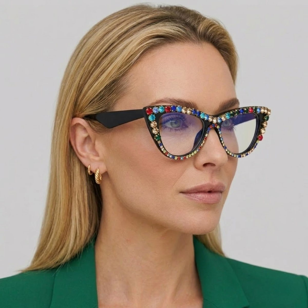 Os Óculos Cath apresentam detalhes de strass e são feitos de plástico de alta qualidade. Com um formato distinto do olho de gato, se destaca. Além da cor multicolorida, oferece uma variedade de estilos de combinação de cores. As lentes disponíveis incluem opções como luz anti-azul, para atender diversas necessidades visuais e benefícios de uso.