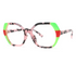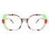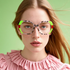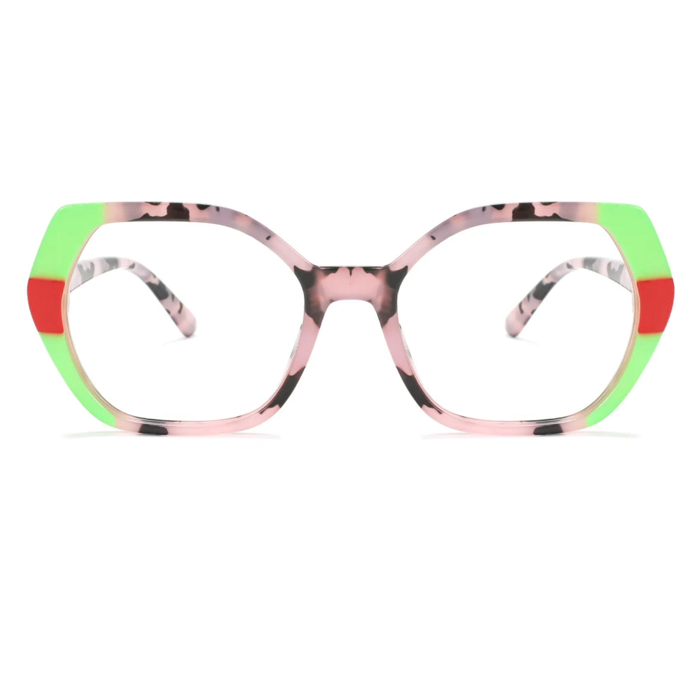 O modelo Romae é uma obra de arte em forma de óculos. A base em tartaruga rosada ganha vida com blocos de cor em verde neon e vermelho vibrante, criando um contraste inesperado e cheio de atitude. A armação maxi e geométrica valoriza o olhar de maneira única, trazendo presença imediata e um ar contemporâneo. Romae é feito para mulheres que não seguem padrões: elas os criam.